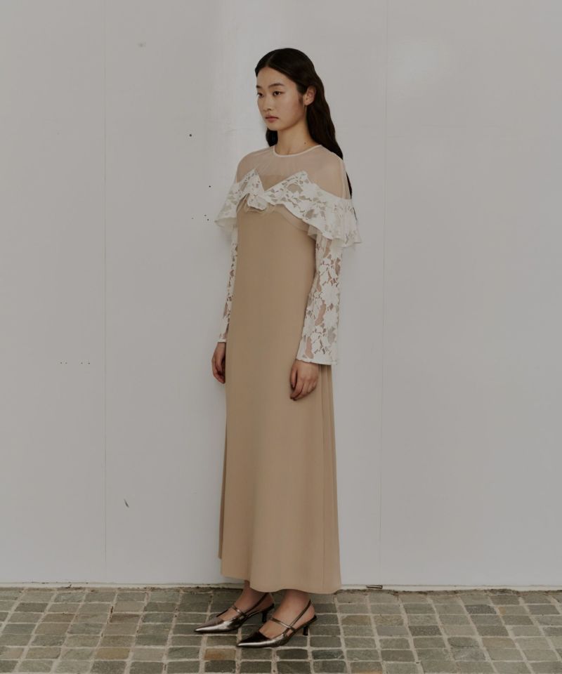バストからスリーブへと流れるレースのラッフルが印象的な一着。