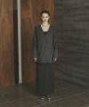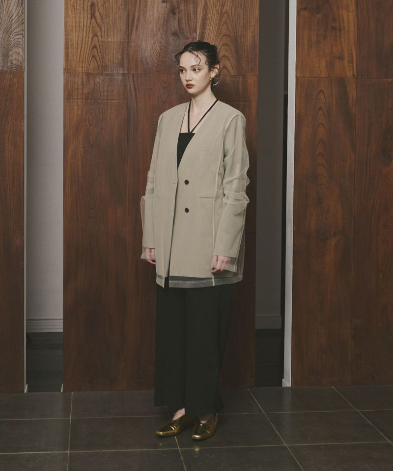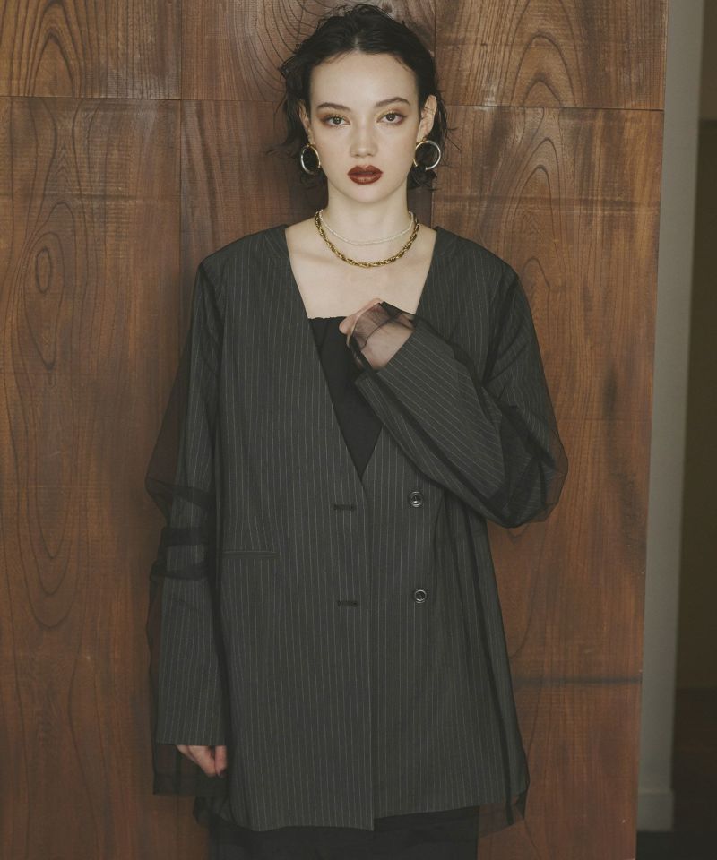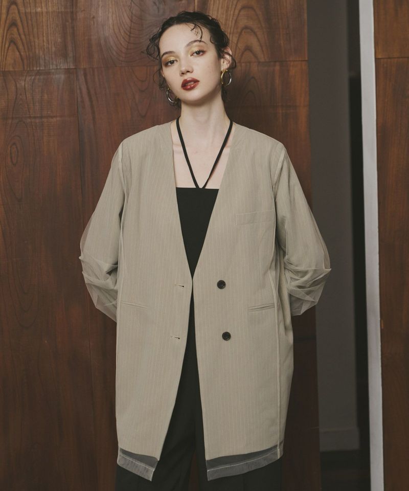 ポリエステル×レーヨンのピンストライプ素材とハリ感のあるチュール素材をレイヤードした、ボクシーなカラーレスジャケットです。