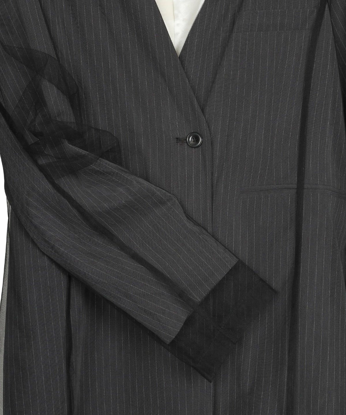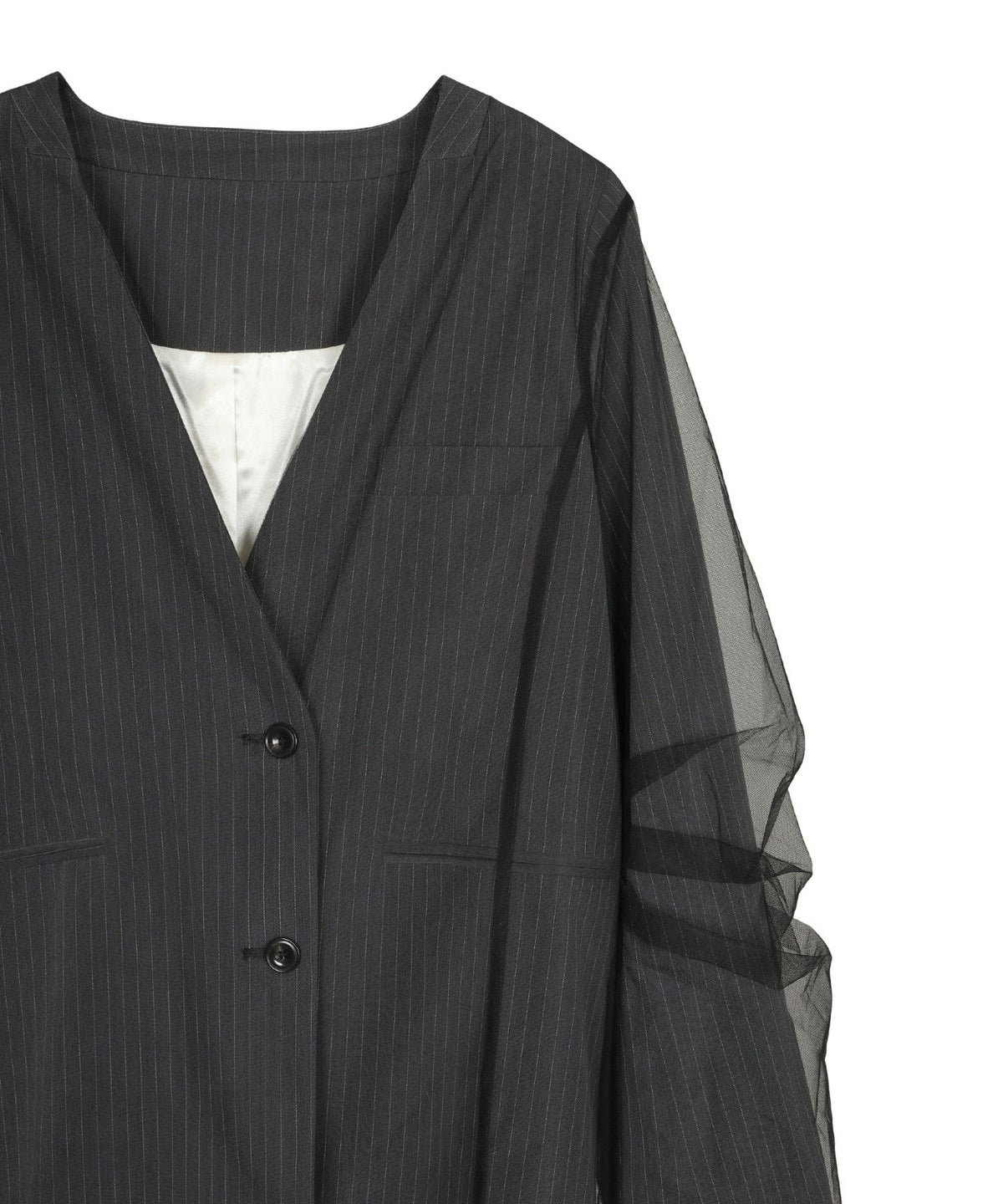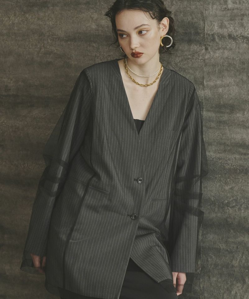 ポリエステル×レーヨンのピンストライプ素材とハリ感のあるチュール素材をレイヤードした、ボクシーなカラーレスジャケットです。