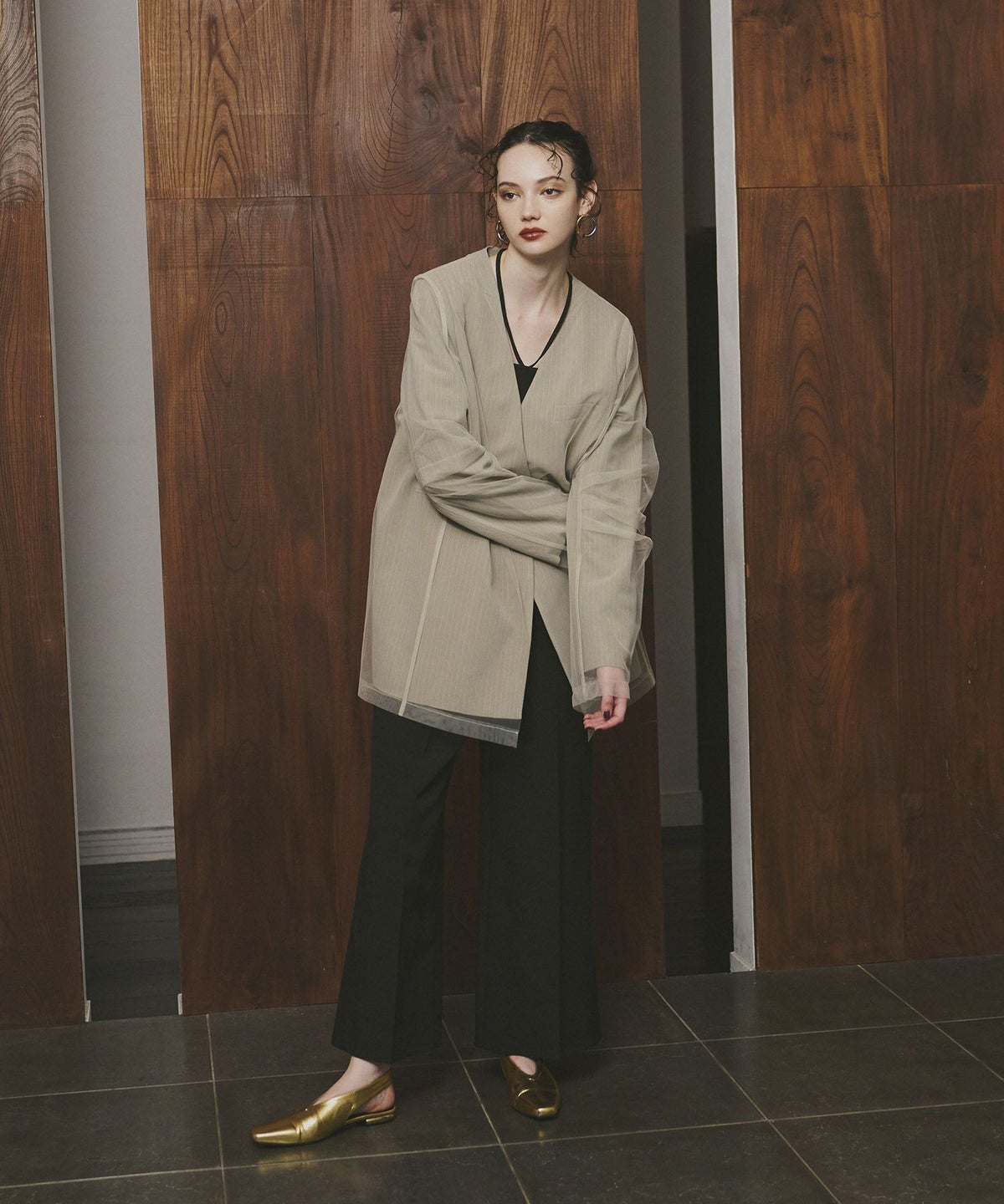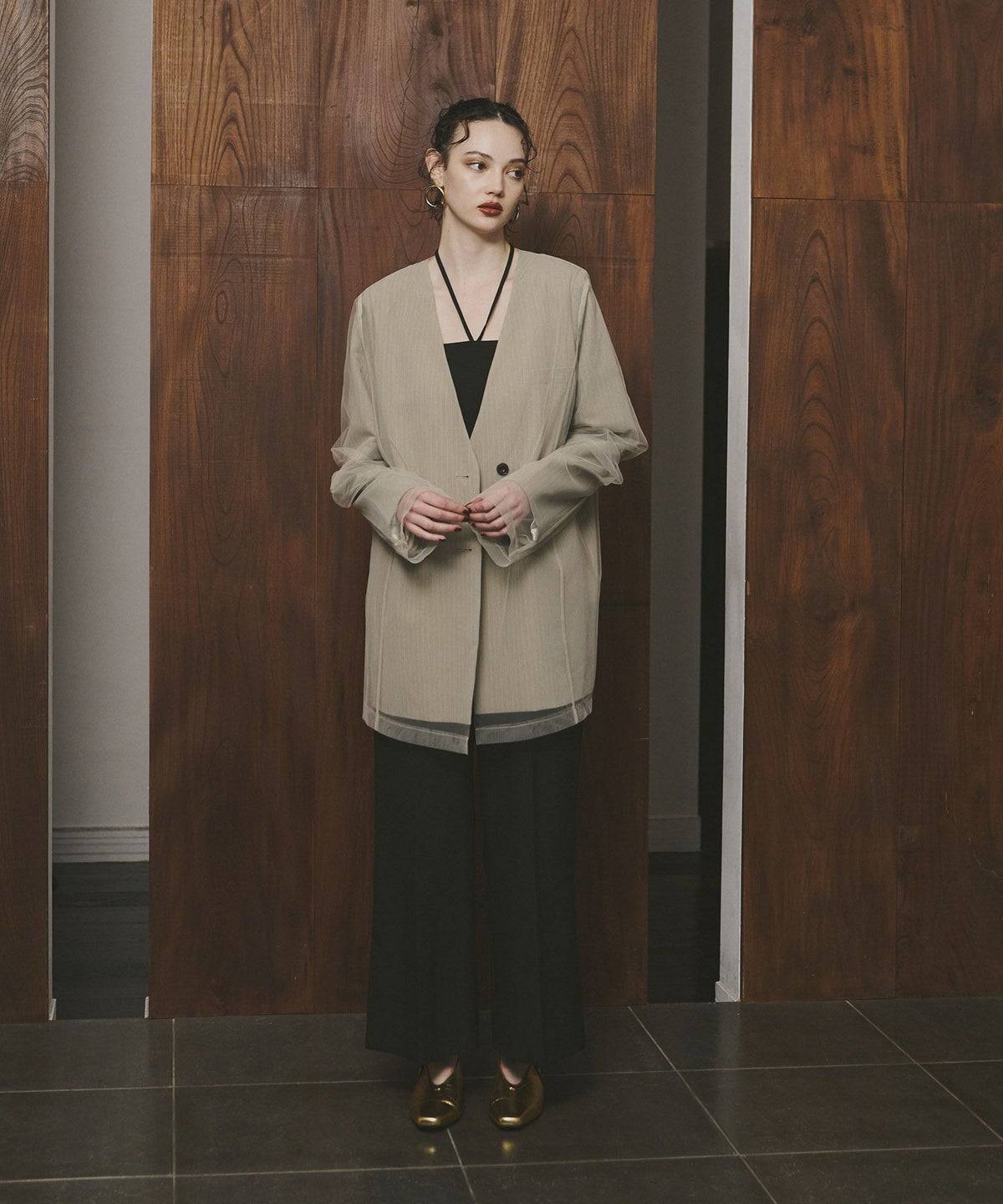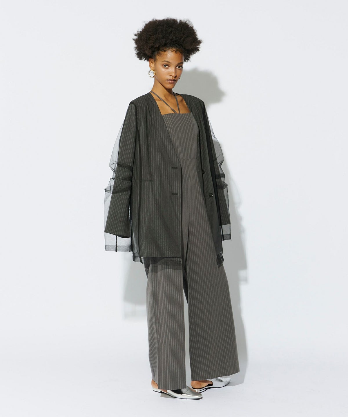 ポリエステル×レーヨンのピンストライプ素材とハリ感のあるチュール素材をレイヤードした、ボクシーなカラーレスジャケットです。