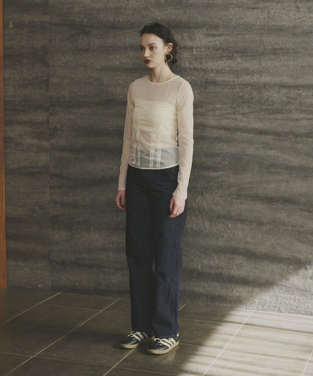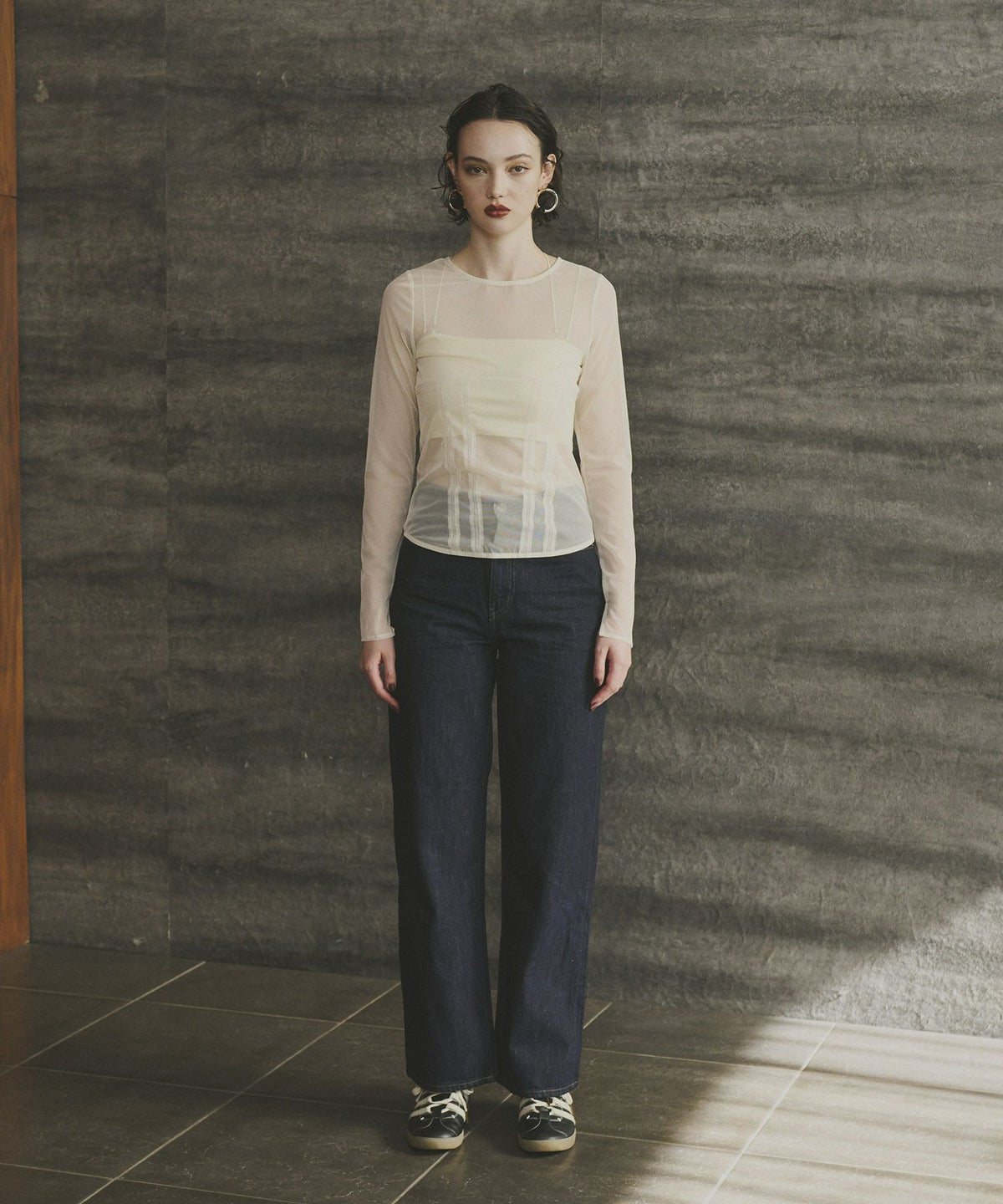 インナーとしてレイヤードすれば肌見せを控えたい時にも便利で、どんなコーディネートにも合わせやすい万能アイテムです。