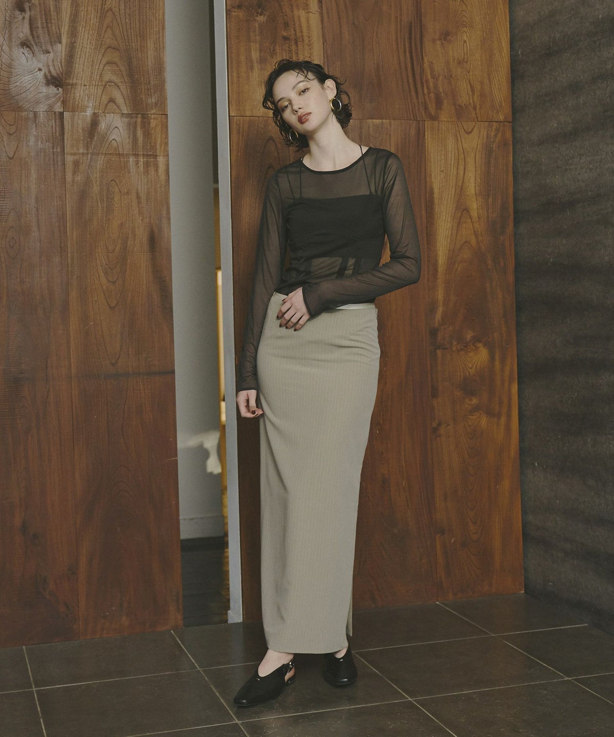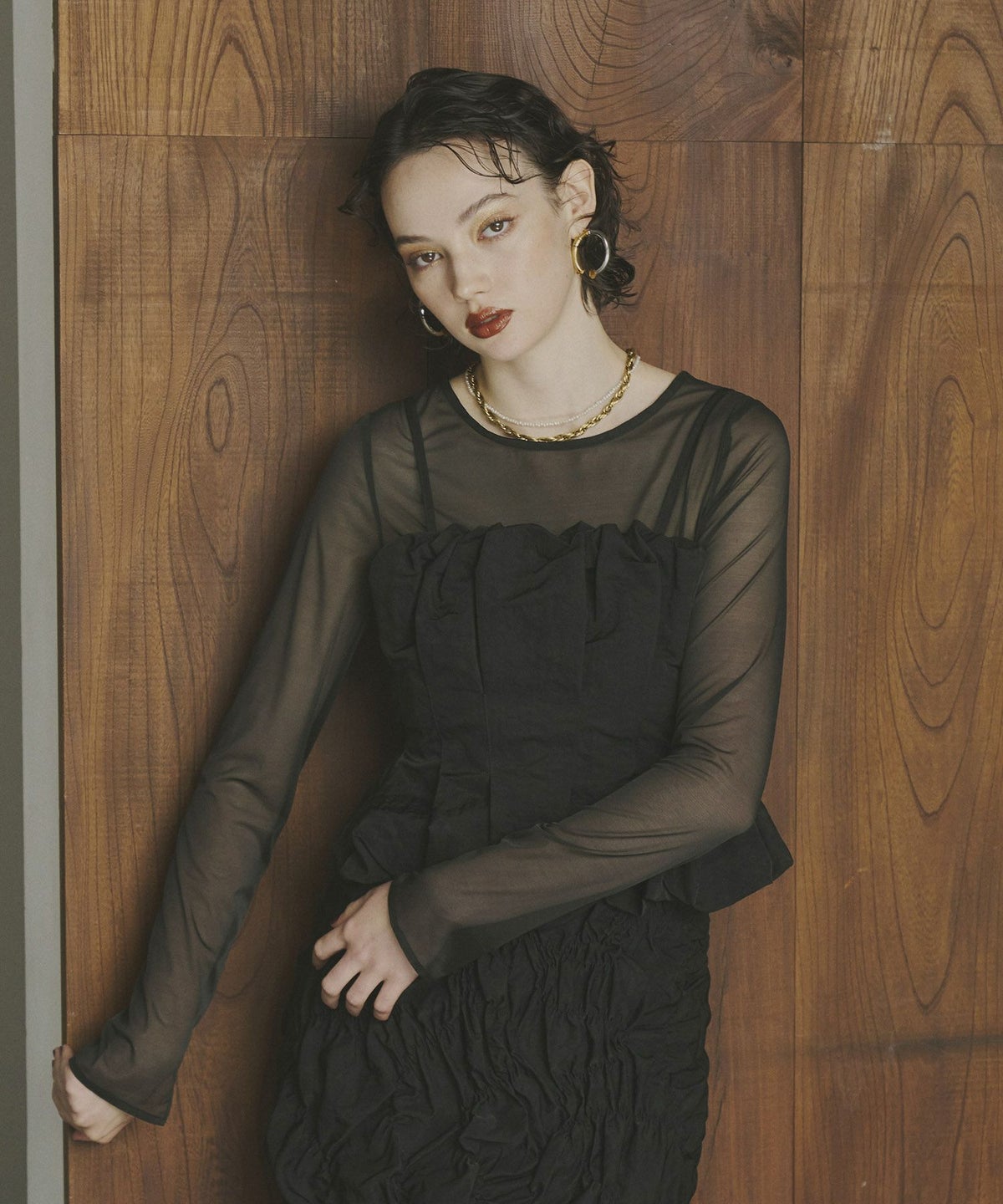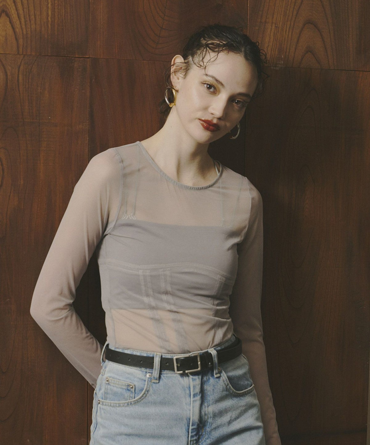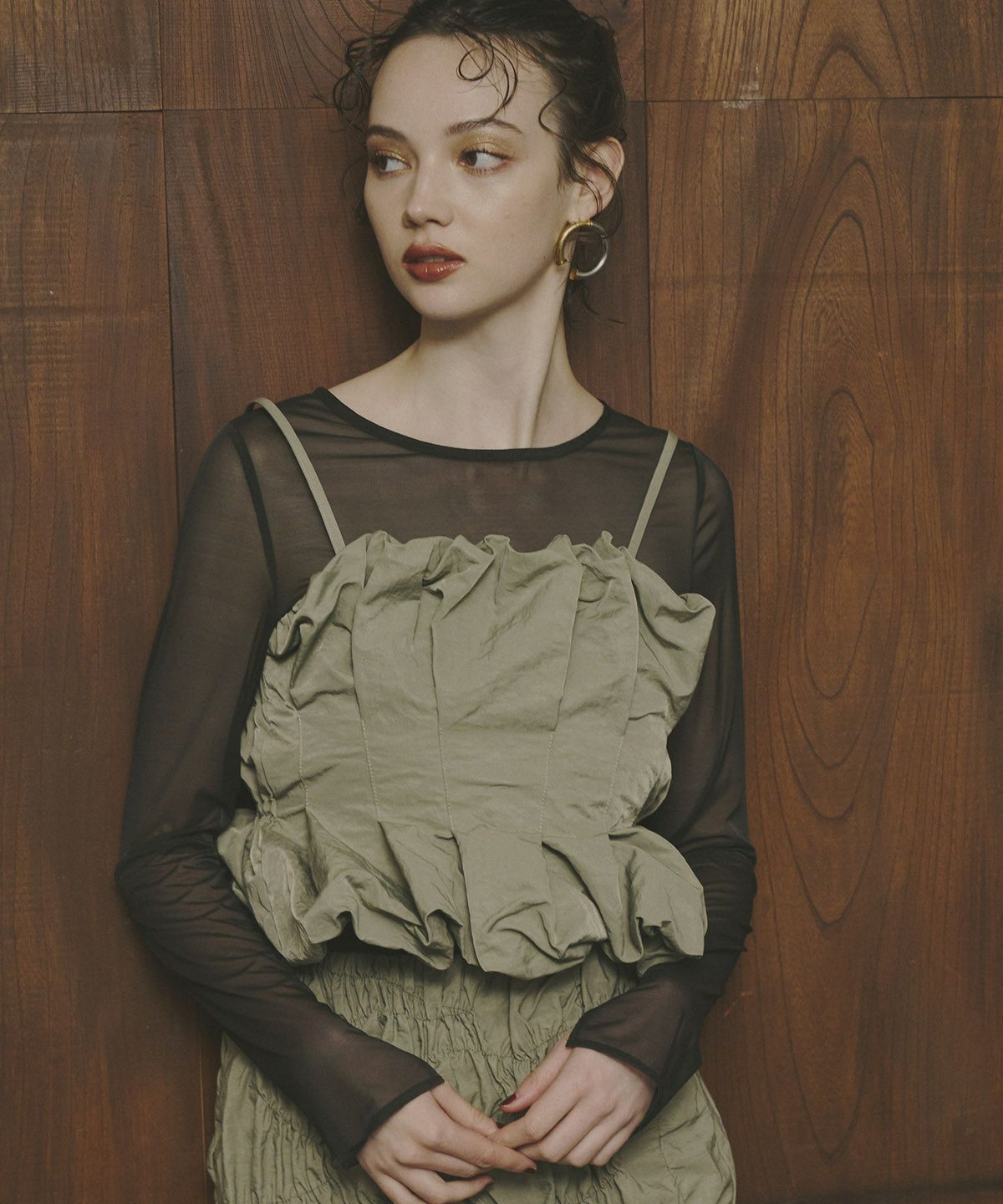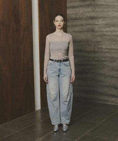 インナーは、ウエスト部分にコルセット風の切替デザインを施し、単品使いでもモードな印象を与える仕様になっています。