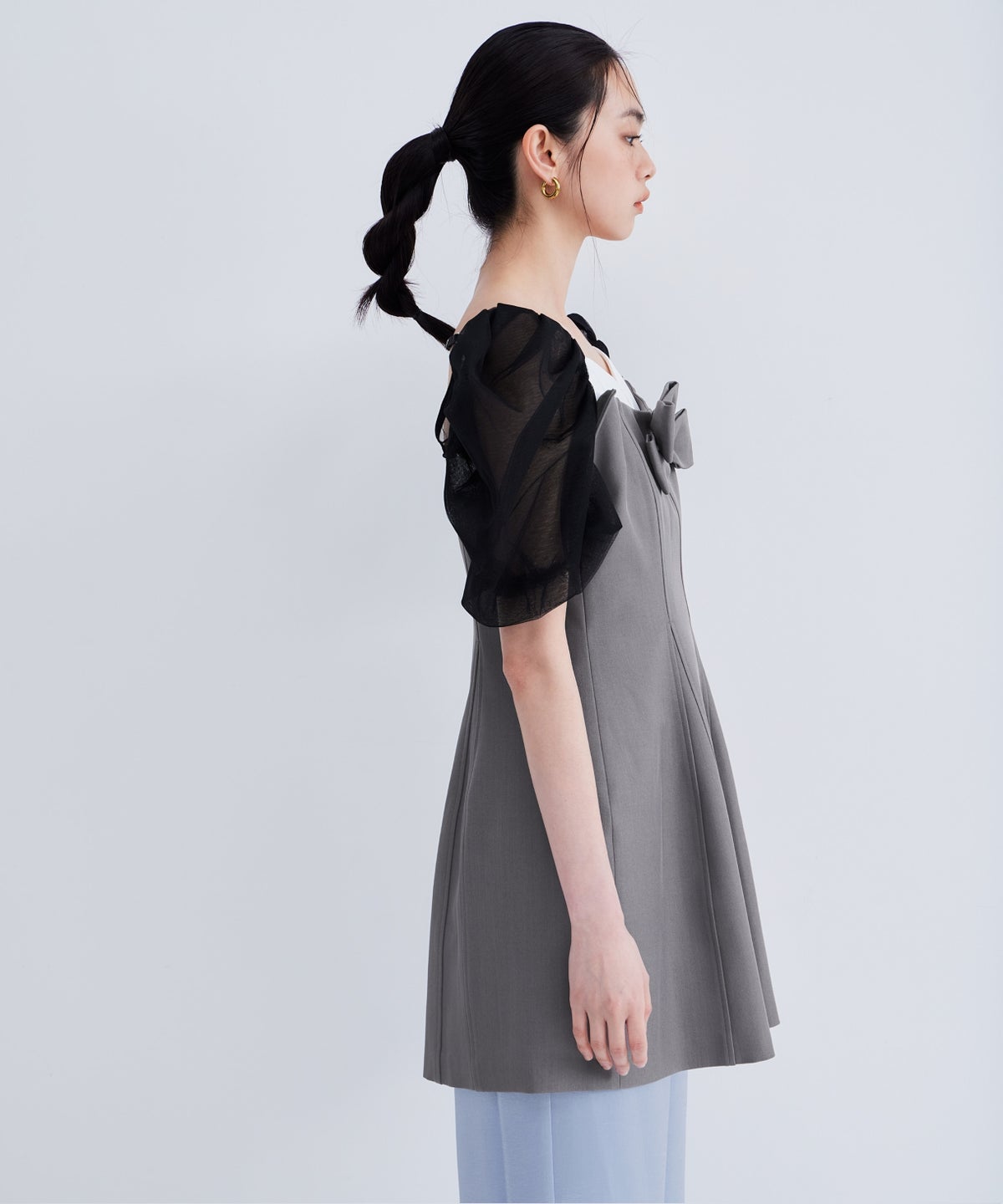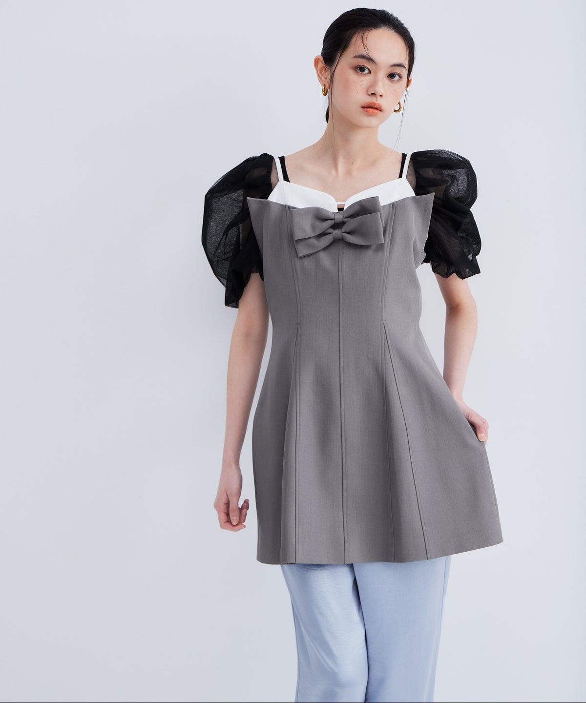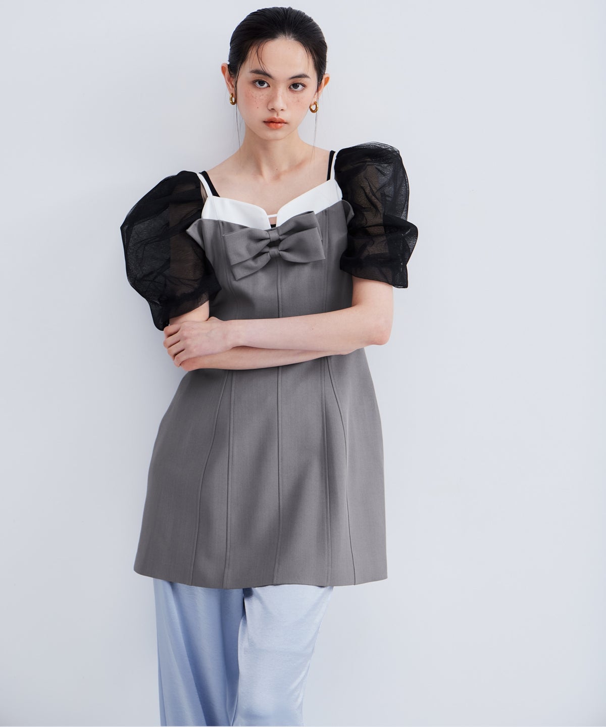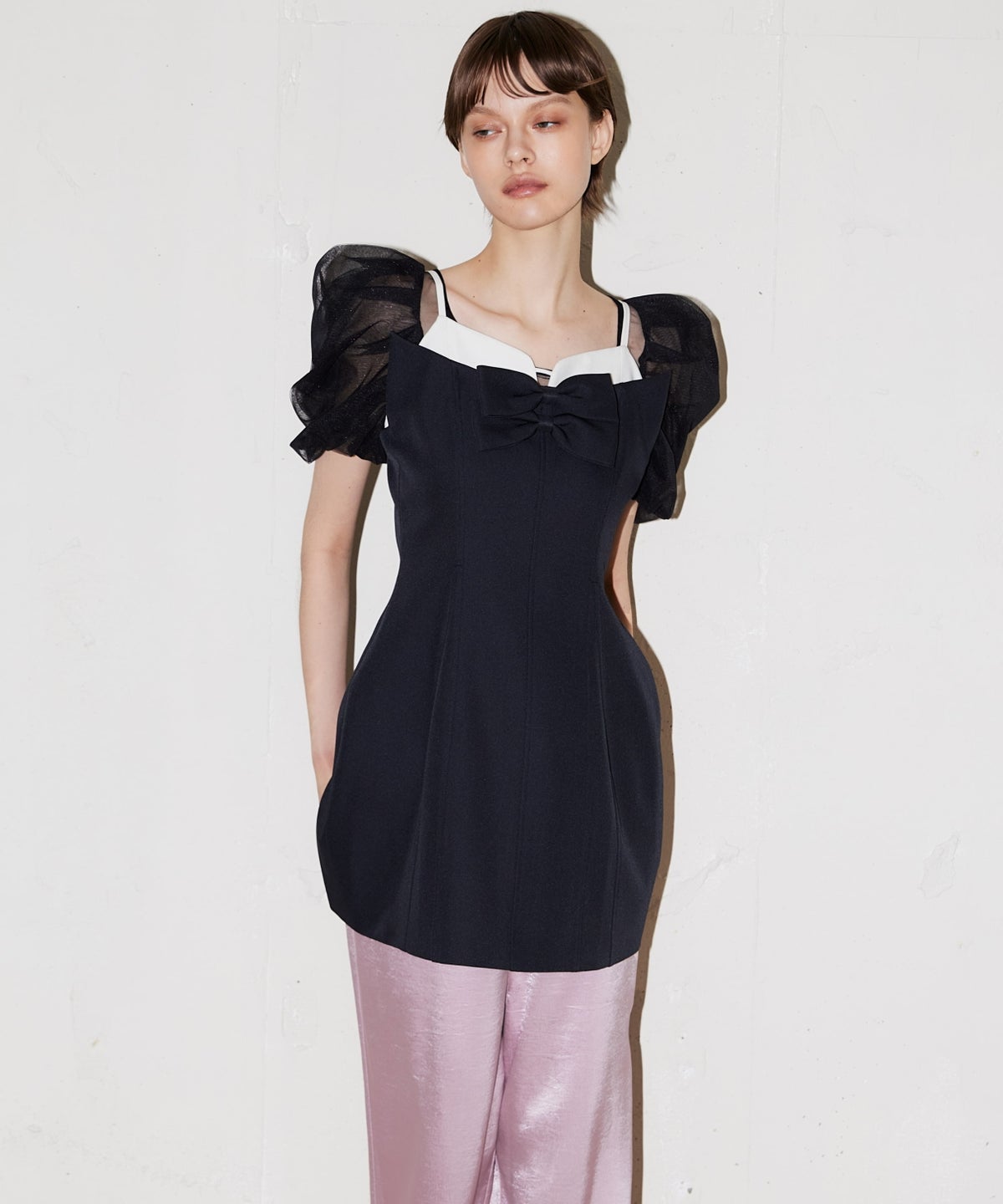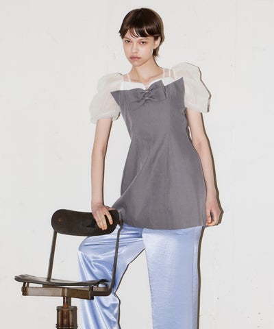 デコルテから袖にかけてはシアーなチュールで仕立て、抜け感のある印象に。