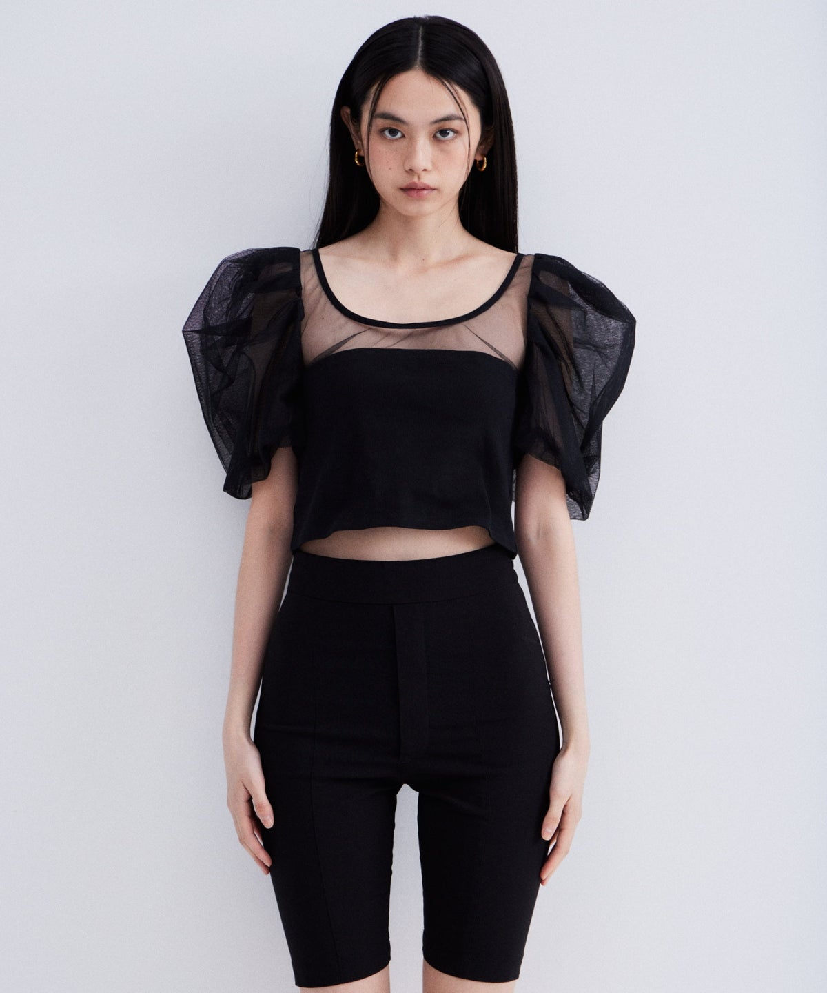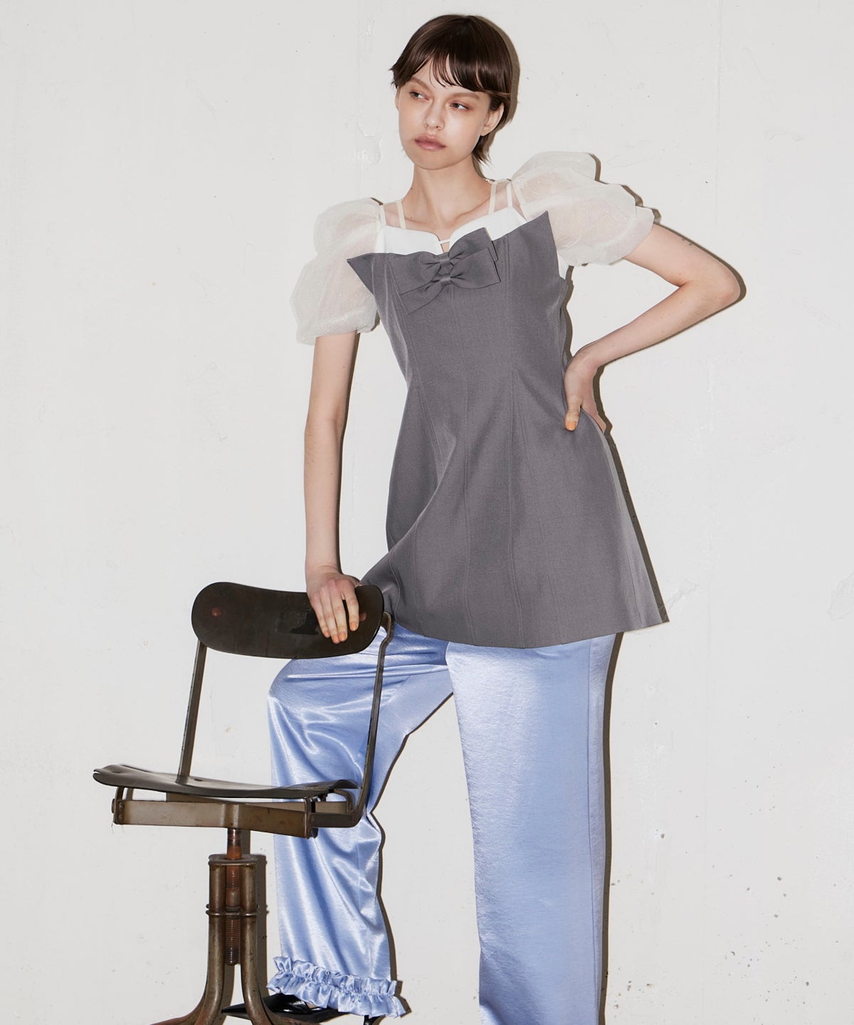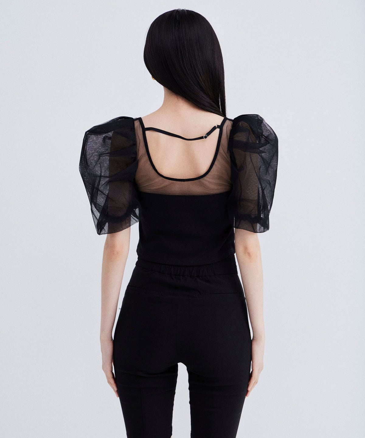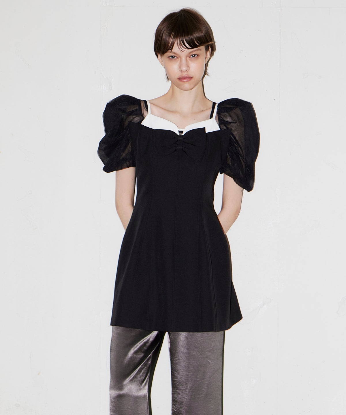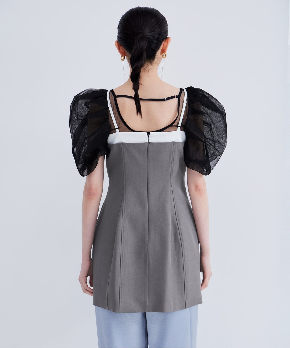 デコルテから袖にかけてはシアーなチュールで仕立て、抜け感のある印象に。
