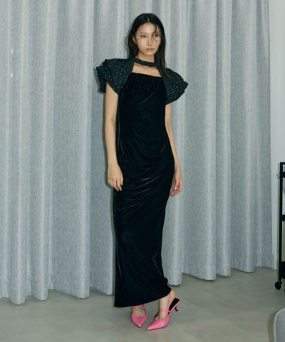 160センチ、46キロでSサイズを購入しました。 ウエストのデザインのおかげで、お腹は少し目立ちにくく、側面のボディラインが綺麗に出てお気に入りです。 ベロア素材はしっかりしているので、下着のラインが出ることなく、安心して着れます。 スリーブは途中までベロア素材があるため、脇が見えにくく、腕は細く見えます。 ボリューム感も可愛いながら、ゴージャスすぎなくて好きです。 ジャケットを着ても、シワになりにくく、形を整えれば大丈夫です(重いコートや長時間の着用ではシワになる不安はあります)。 アパレルの友達にも「正直今まで見たドレスの中で1番可愛い」と言ってもらえるくらい最高です。周りと被らないデザインもお気に入りポイントなので、真面目にレビューしすぎて後悔しつつあります。 本音では新作(も買いますが)どんどん出していただいて、早く販売終了しないかなと思ってます。